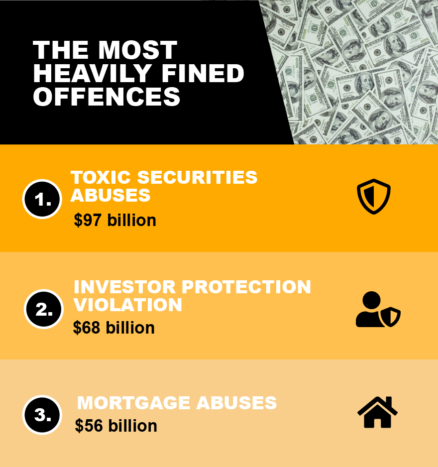 The offence that saw the heaviest penalties overall for financial institutions was ‘toxic securities abuses’ which refers to the sale of investments that are either difficult or actually impossible to sell on, due to demand for them collapsing.