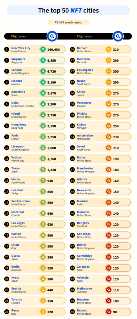 By far the most popular NFT city is New York, which received more searches than all the other cities in our study combined! The Big Apple is an instantly recognisable urban landscape with a very unique aesthetic that is known the world over. One of the most culturally important cities in the western world, New York is a melting pot of people and cultures from every nation under the sun, which could go some way to explaining the colossal 140,450 NFT searches that the city received.